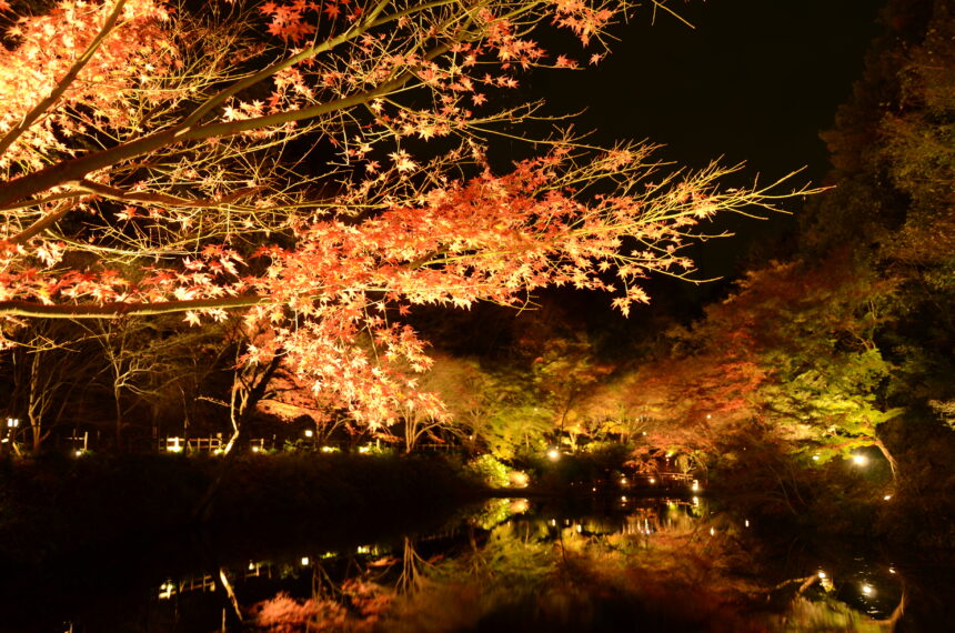 水面に映るもみじは美しく、104体の石仏と竹あかりが幻想的な雰囲気を醸し出します✨