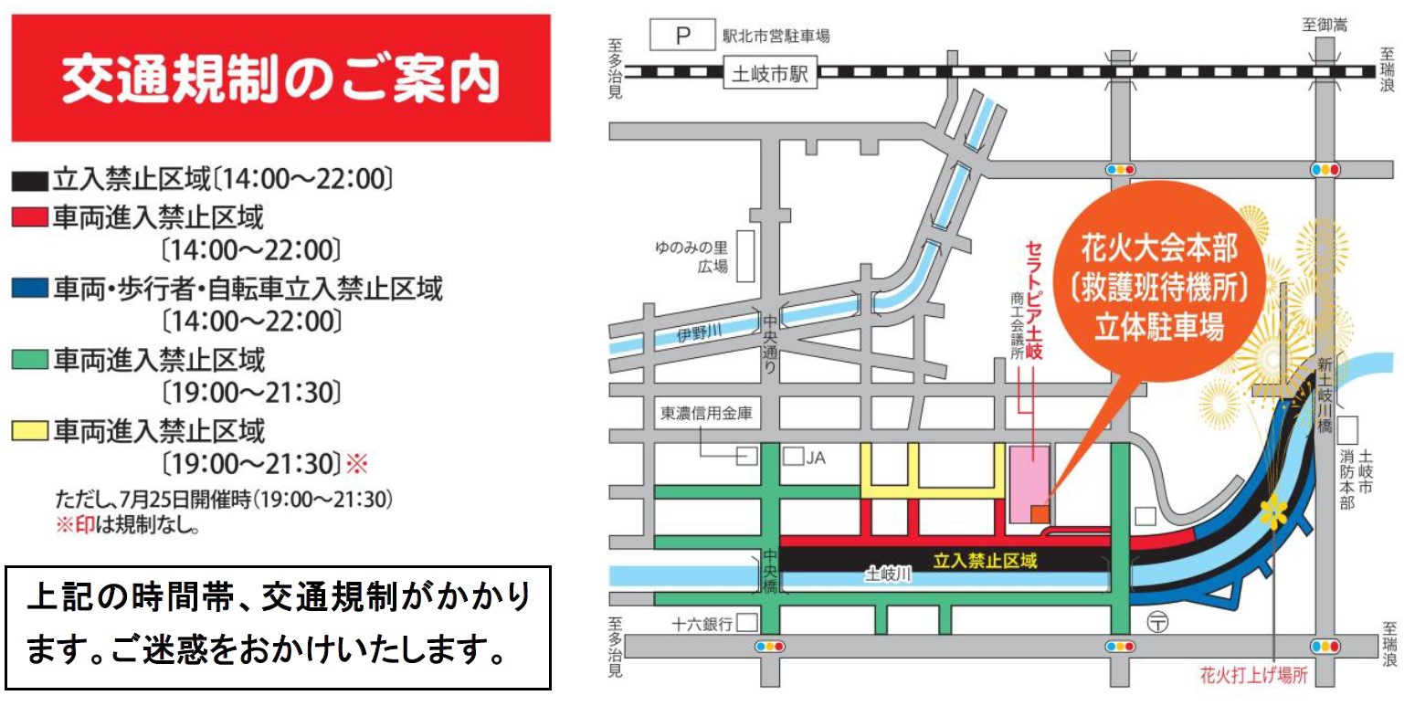 打ち上げ現場周辺(土岐津橋~新土岐津橋間の堤防道路)・浅野緑地公園は14時~22時まで交通規制・立ち入り禁止の為、通行も観覧もできません。