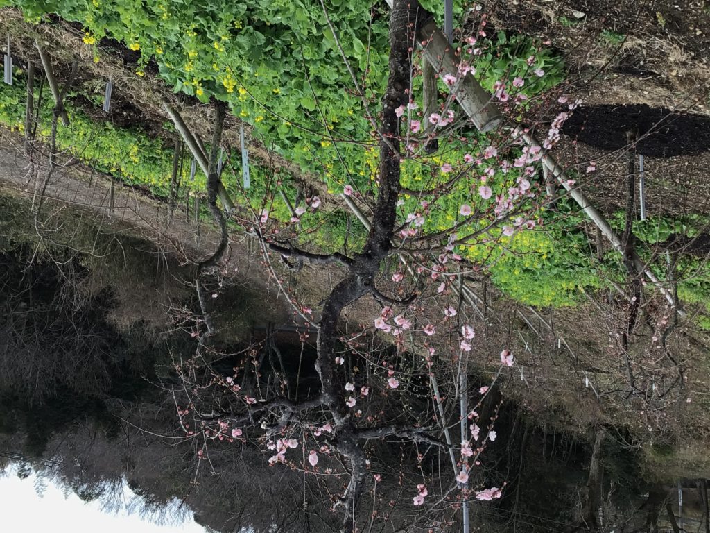 きれいなピンク色のしだれ梅が咲いています!ピンク色と白色の梅の花と、黄色の菜の花も見ることができますよ!!