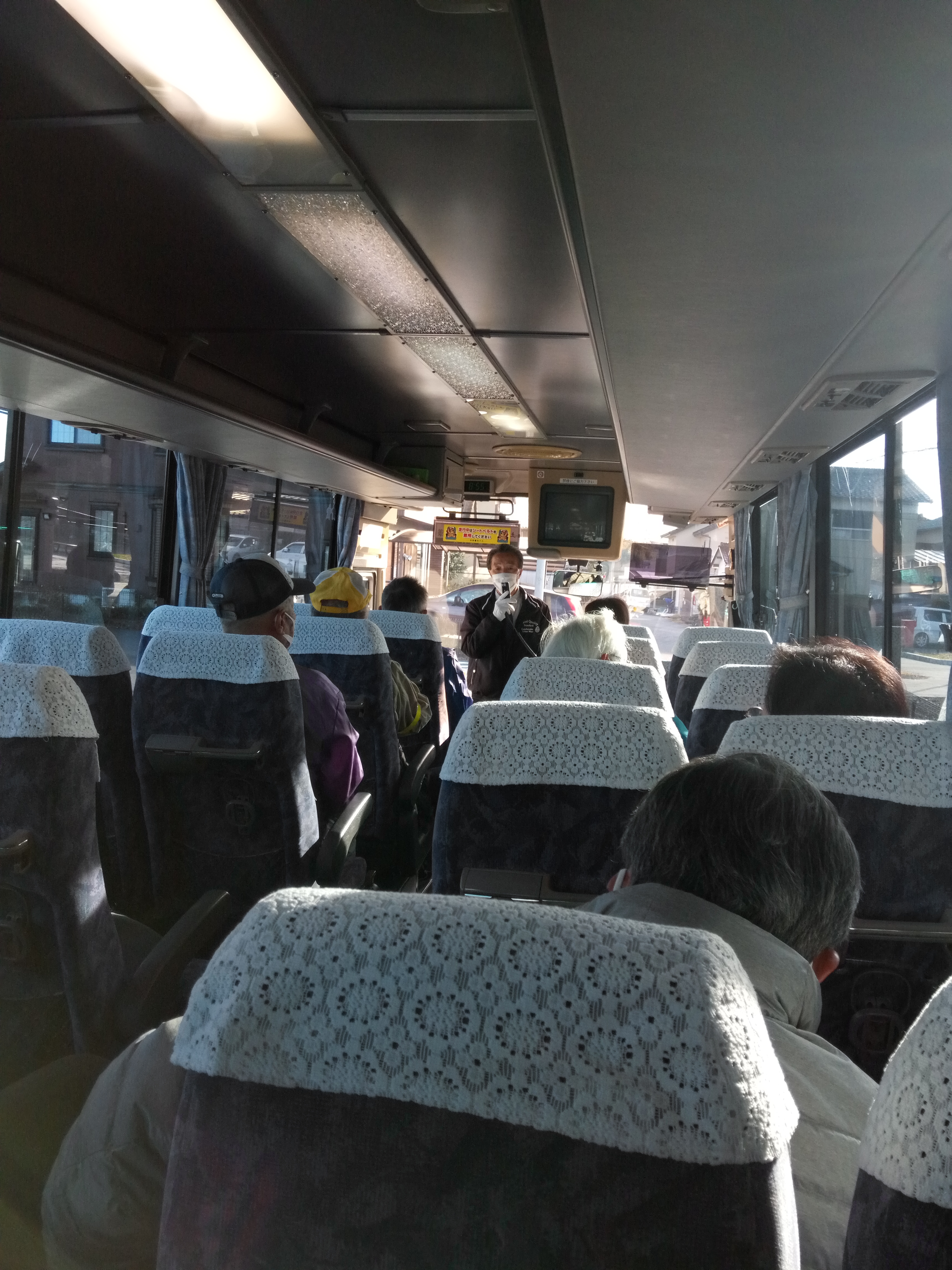 土岐市内をバスで出発、感染症対策のため、マスク・手指消毒・窓を少し開けて出発しました!