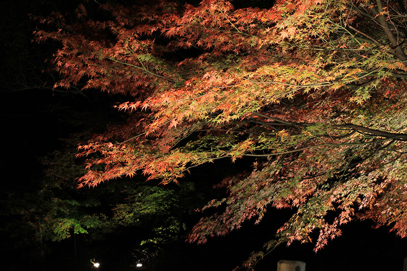 池を取り巻く楓・もみじの古木が数十本あり、ライトに照らされて水面に移る姿は息をのむ。