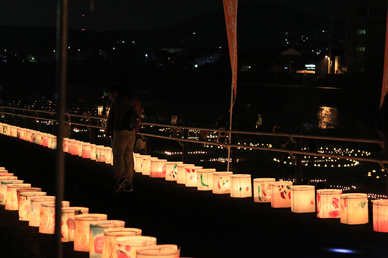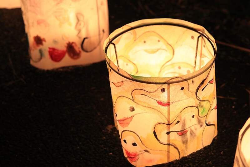 地元の子供たちの手造りによる陶製灯ろうとランプシェード約2000個にあかりを灯します。