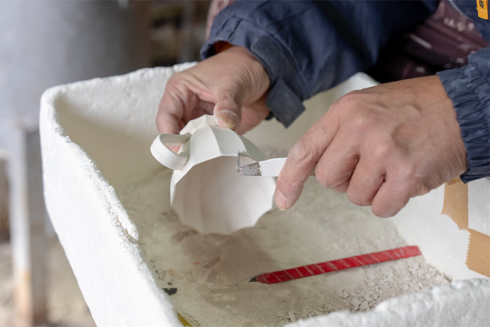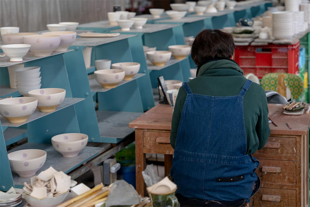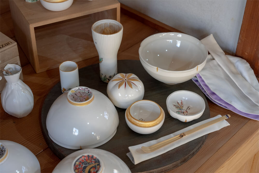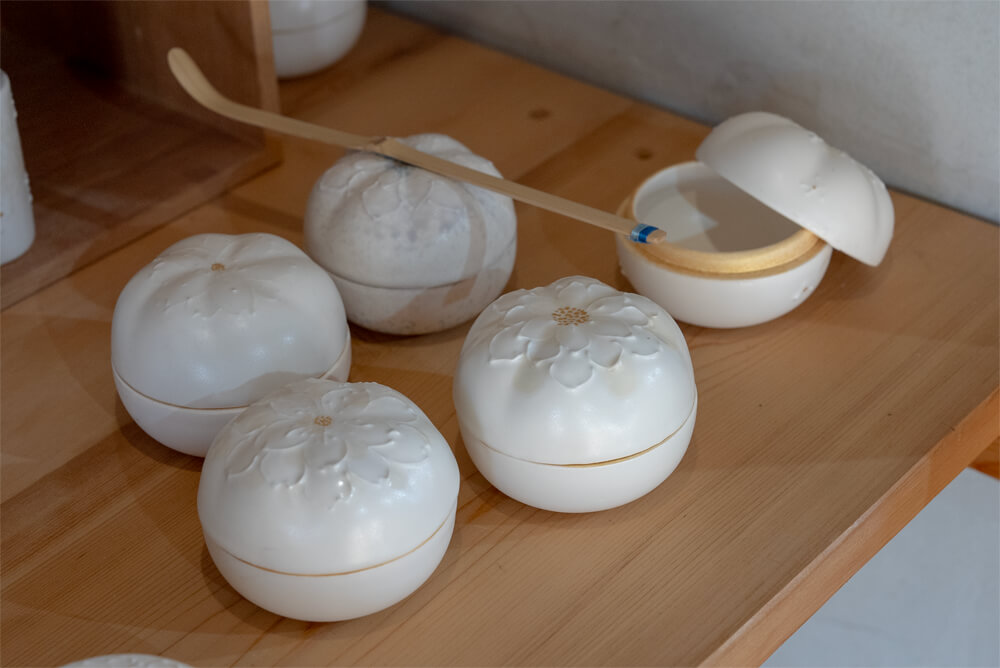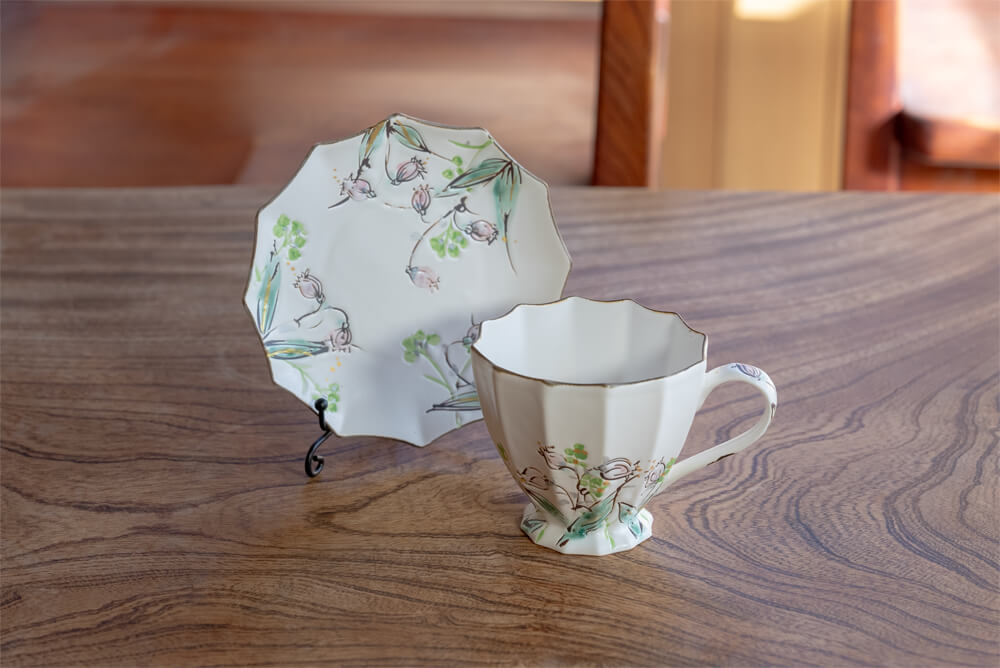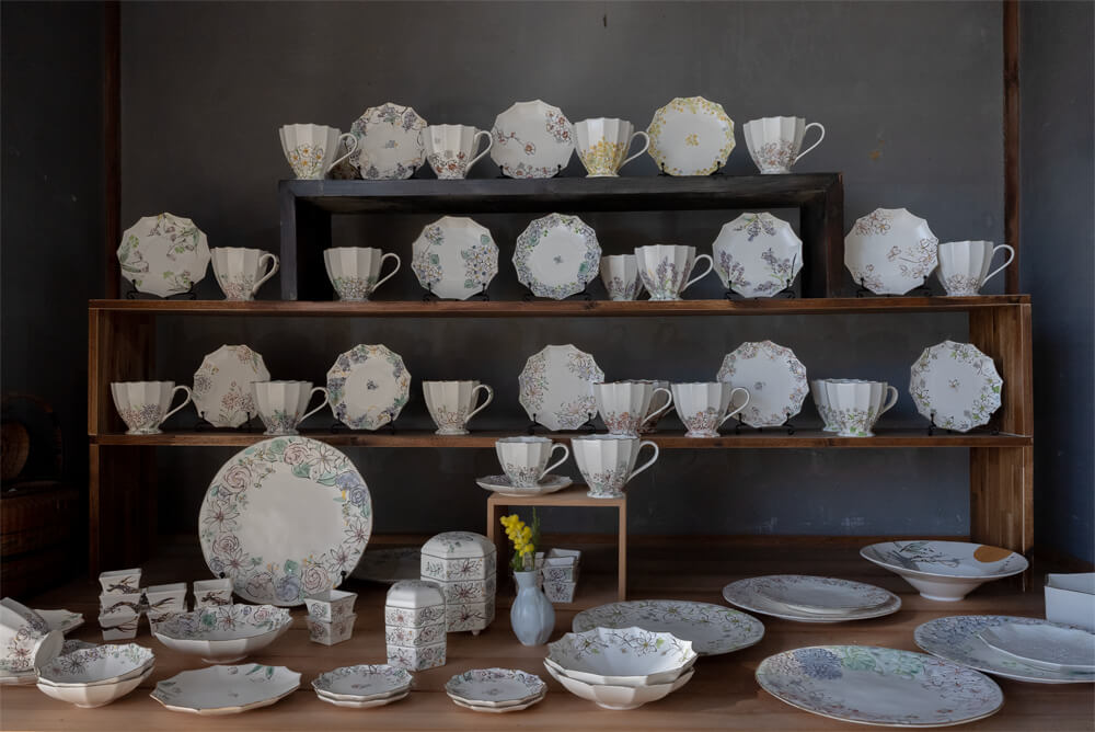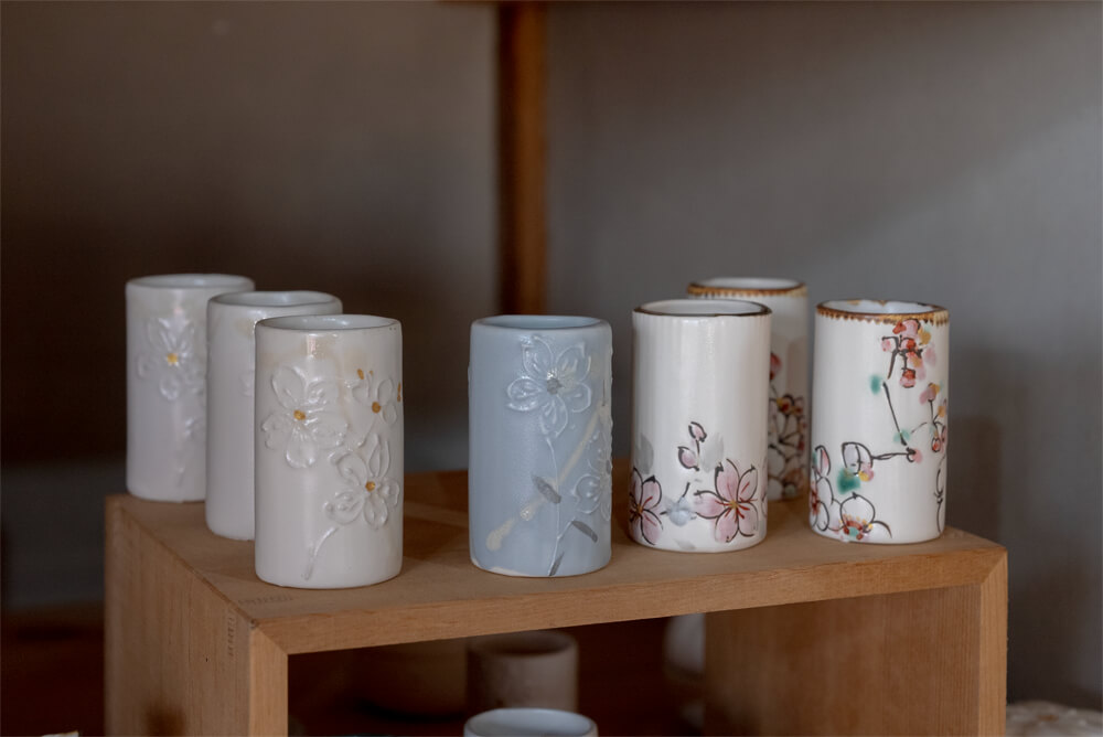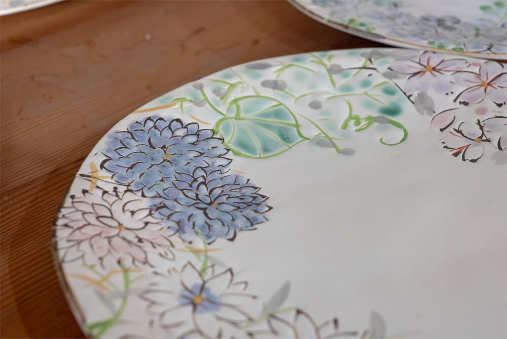 草花や水や雪の模様を筆やスポイトを用いて器に描き、