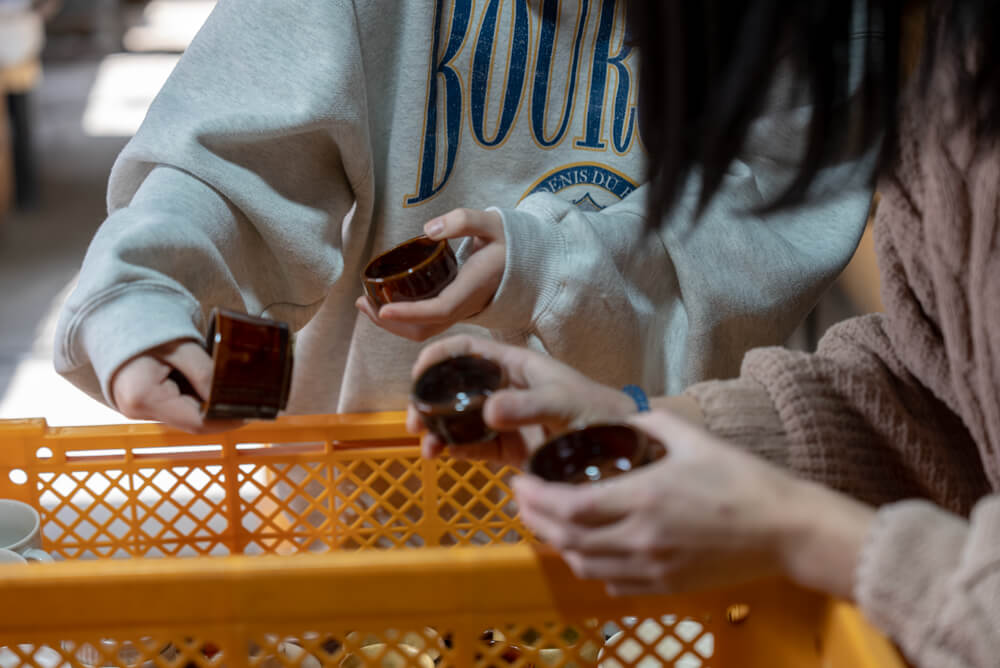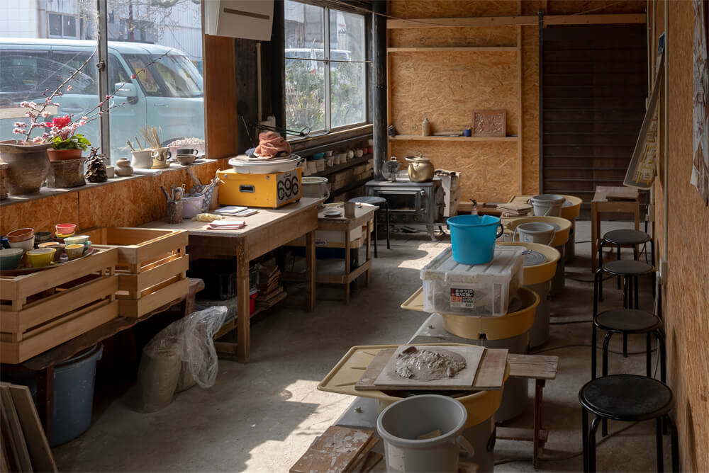 今も尚、一歩足を踏み入れるとその歴史を色濃く残した製陶所があちらこちらに立ち並ぶ風景が広がります。はまぐり窯はそんな集落の中でひっそりと、もの作りをしています。それぞれの個性あふれる作り手が思い思いに作陶に向き合う。それがはまぐり窯です。電気、灯油、薪の3種の窯の特徴を生かした作品作りをしています。他にはない作品の数々をお楽しみください