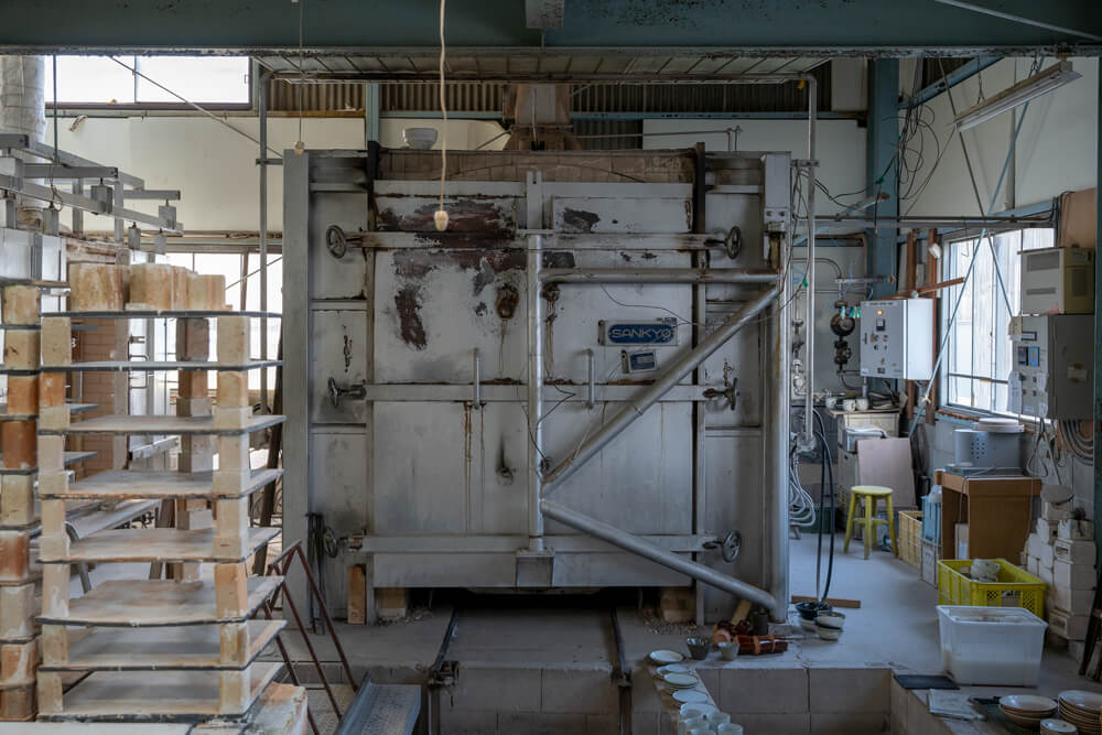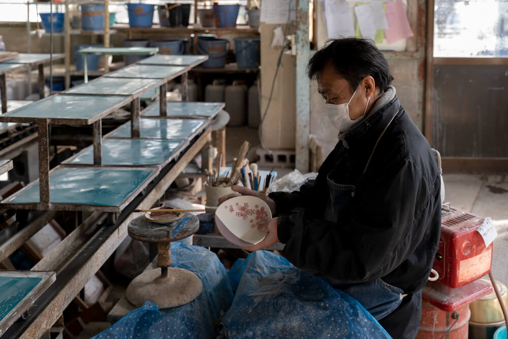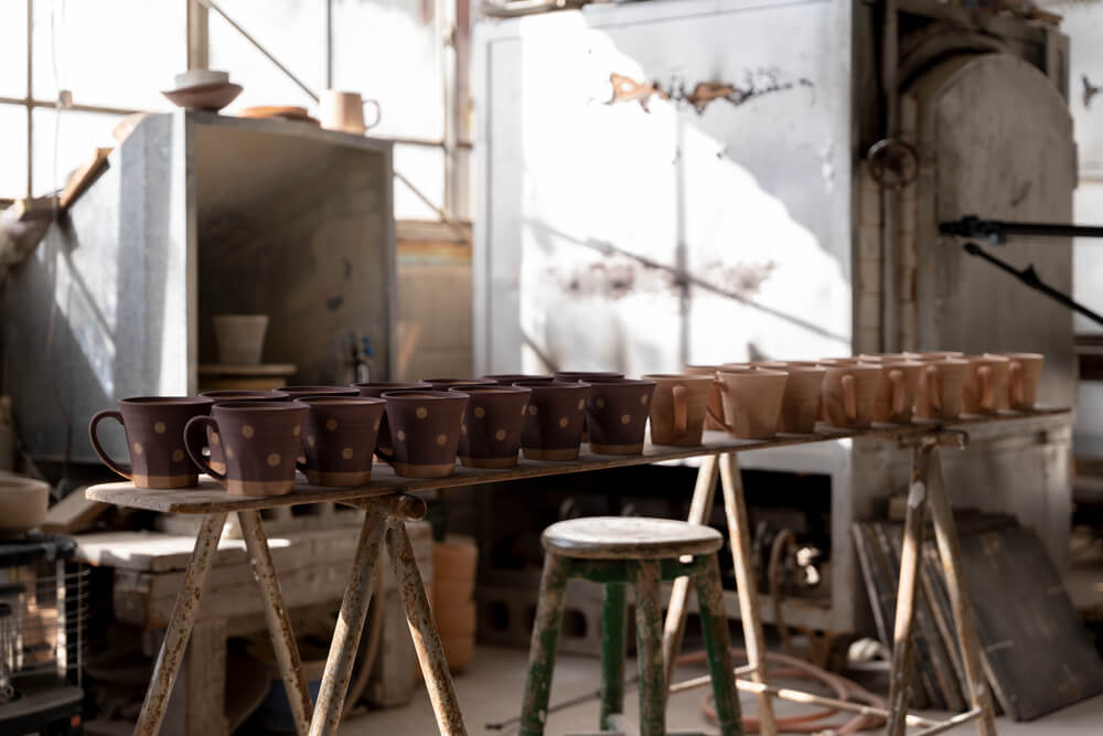 粉引きを中心とした器でdotやボーダー柄などの模様を手書き、手彫りしています。