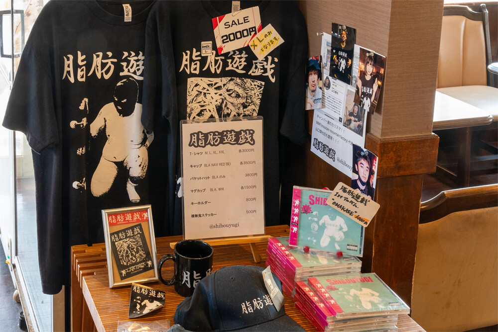 オーナーの参加しているバンド「脂肪遊戯」のグッズも販売しています。