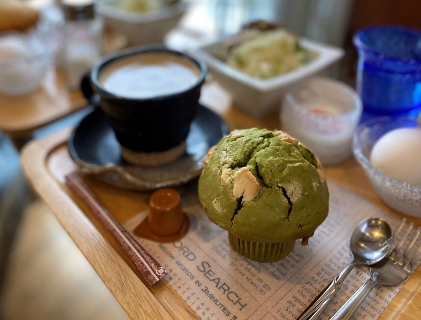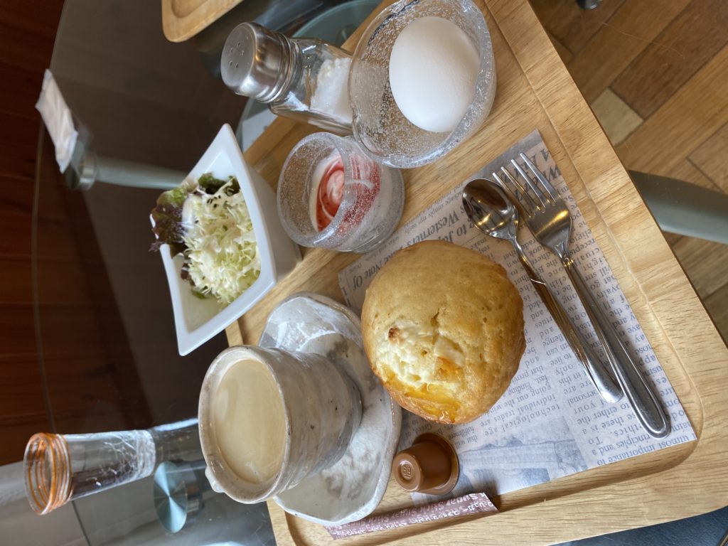モーニングは、ドリンク代のみでトースト・サラダ・ゆで卵・ヨーグルトがついてきます。+180円でトーストがマフィンに変更できます。