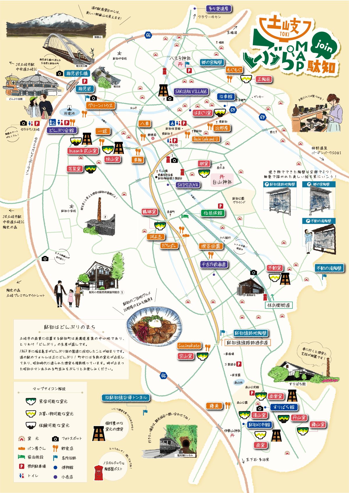稚児岩 グリーンハウス 八車 どんぶり会館 だち一球 武山窯 快山窯 車鮨 芳泉窯 鶴琳窯 河よ志 だちぱん CucinaKato ㈲宗山窯 駄知線日帰トンネル 藤美 ㈱多々楽達屋 郷の宮陶壁 もぐもぐ 正陶苑 SAKUZAN VILLAGE 旧車館 はまぐり窯 比那屋 Dachi Café and U 樹窯 SHIMIZUYA 伯翁旅館 喫茶田園 千古乃岩酒造(株) 不動窯 不動の滝陶壁 駄知線跡地陶壁 南楽窯 すりばち館 清山窯 丹山窯 藤山窯 南窯 駄知印判館