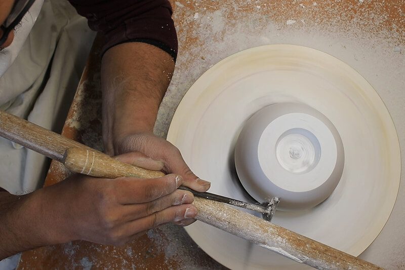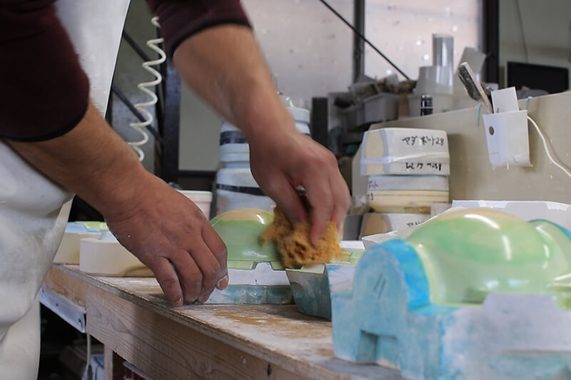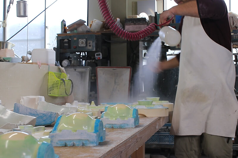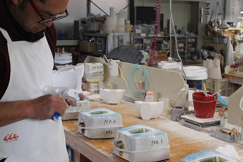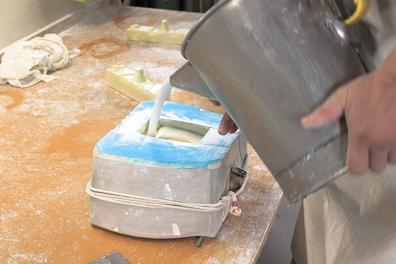 石膏型に泥しょうを流し込み、乾燥させてから余分な泥を捨て、さらに乾燥させて型から外す“ガバ鋳込み”
